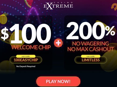 Casino Extreme $100 No Deposit Bonus Codes Experience the thrill at Casino Extreme with a remarkable $100 No Deposit Bonus using the code 100EASYCHIP. This bonus is applicable to Non-Progressive...